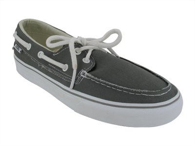 TEST Vans Footwear The Zapato Del Barco. Low top moc toe with contrast laces, eyelets, and stitching; laces run through shoe around heel; canvas upper; padded collar; whip stitch toe detail; waffle rubber sole with pinstripe detail. By Vans.